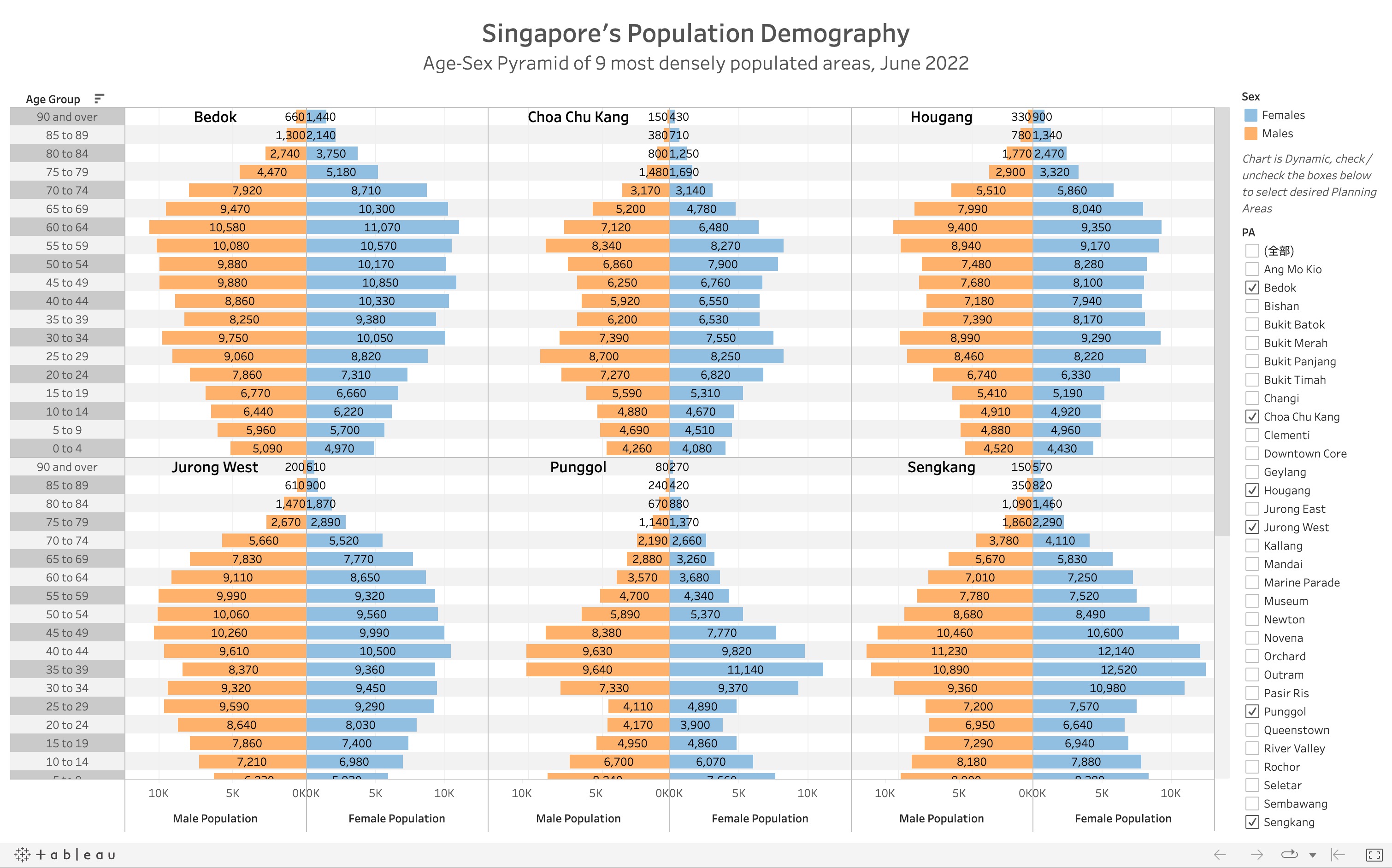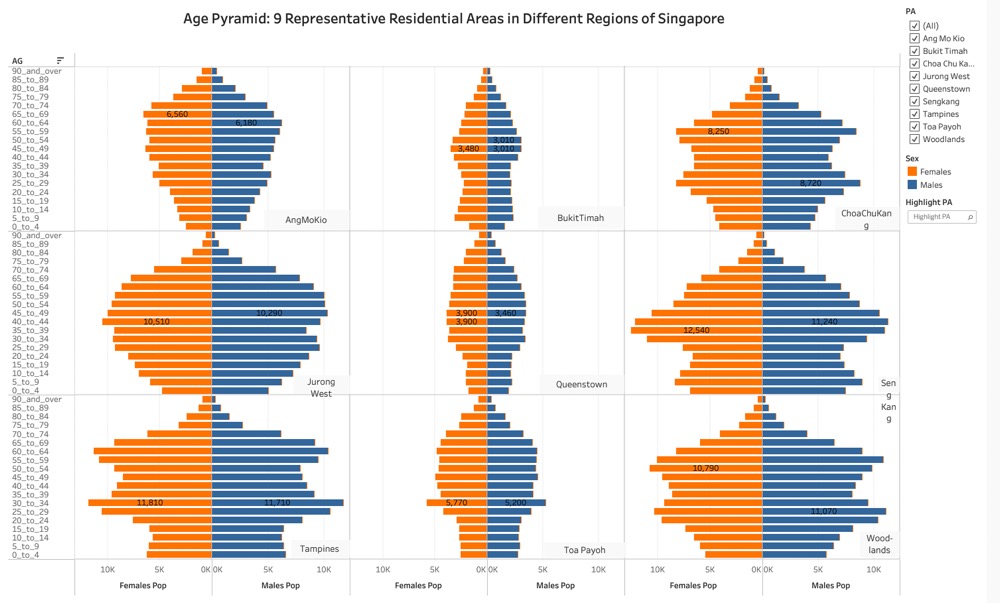 Reveal demographic structure of nine selected planning areas on a single view by using trellis display.